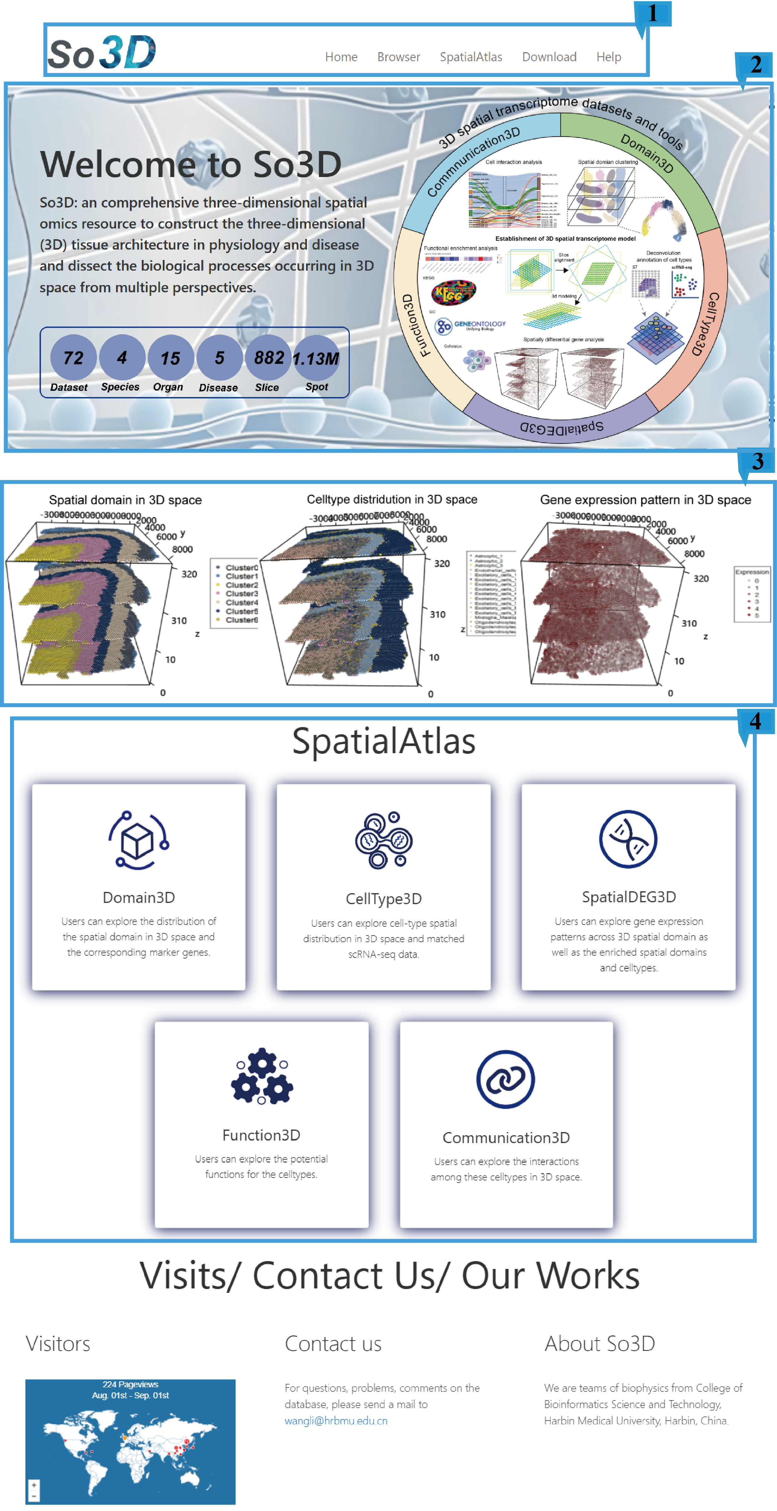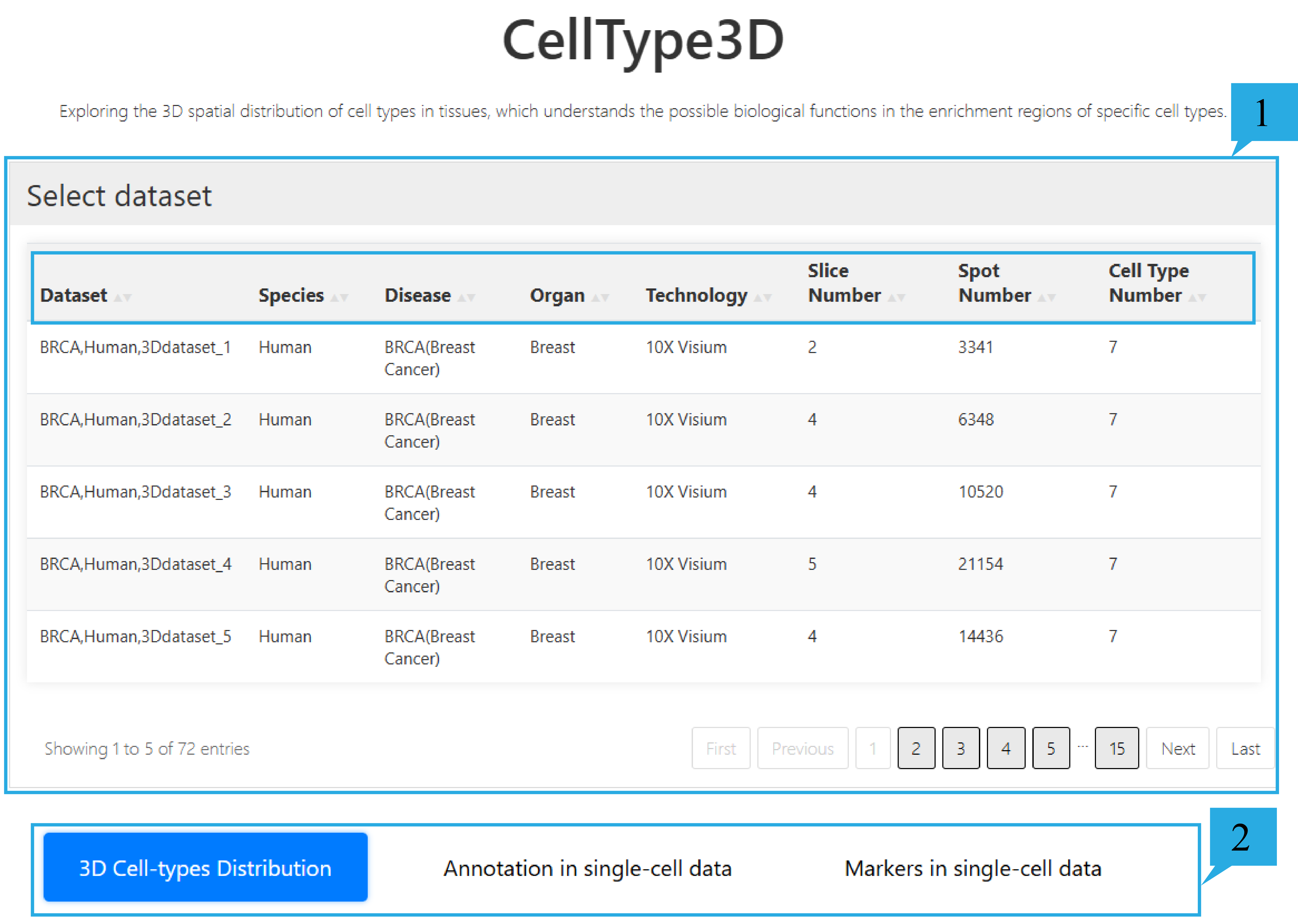 1.The table presents the datasets and their basic information stored in the database, including 3D spatial transcriptome dataset number, Species number, Organ number, Disease number, Slice number, Spot number, Spatial transcriptome sequencing technology number, single-cell dataset number, and the number of cells in single-cell datasets.