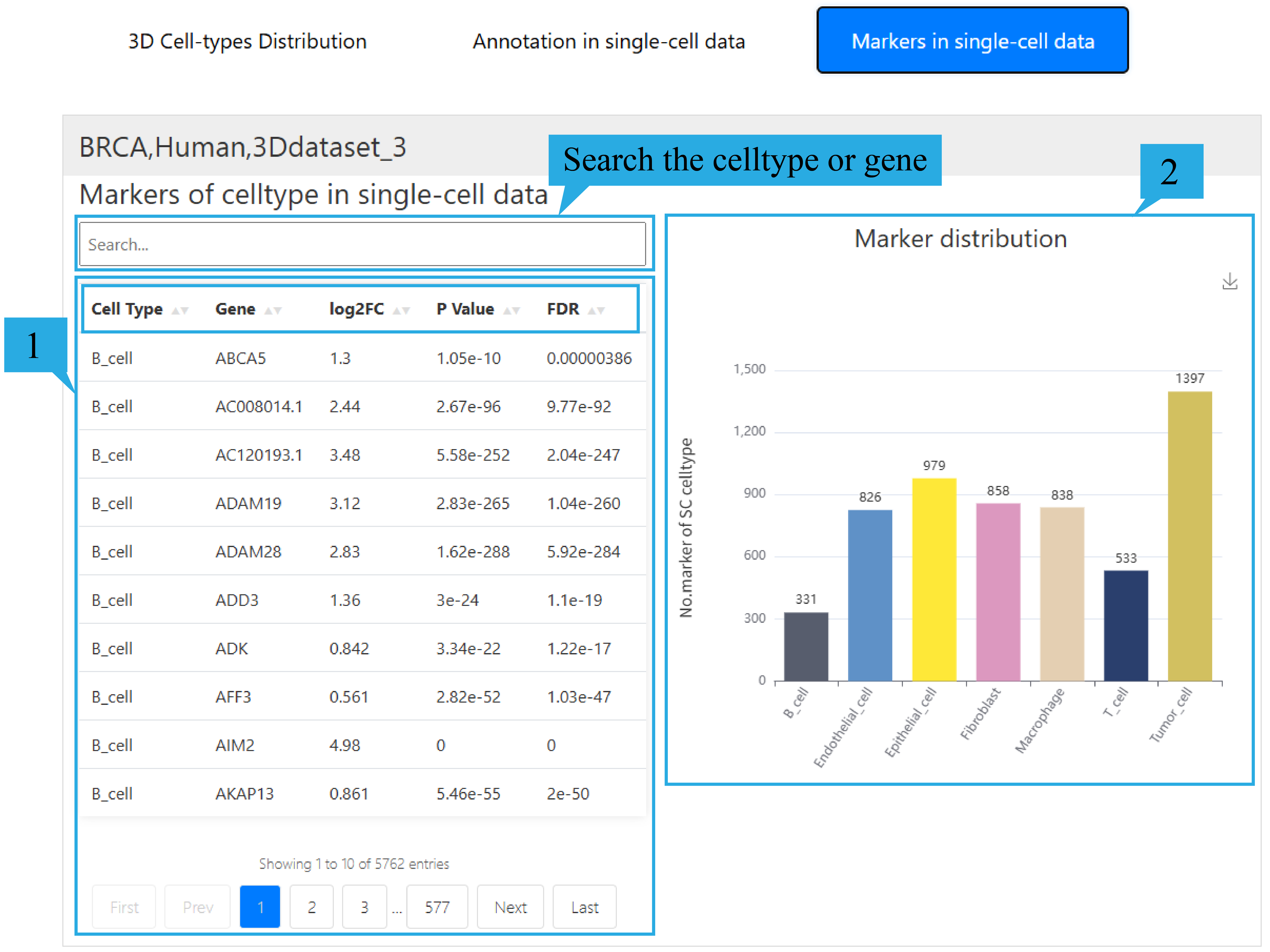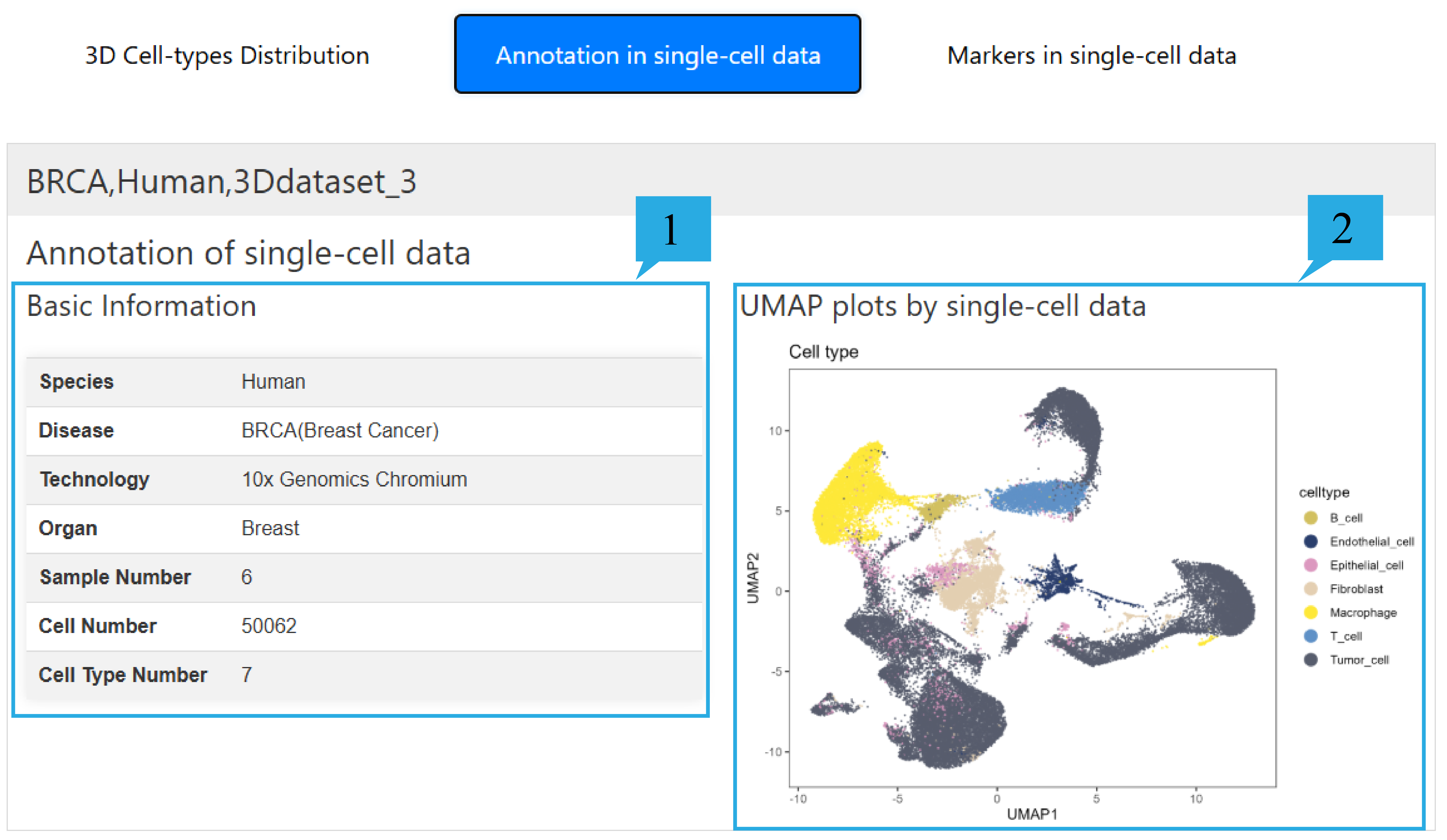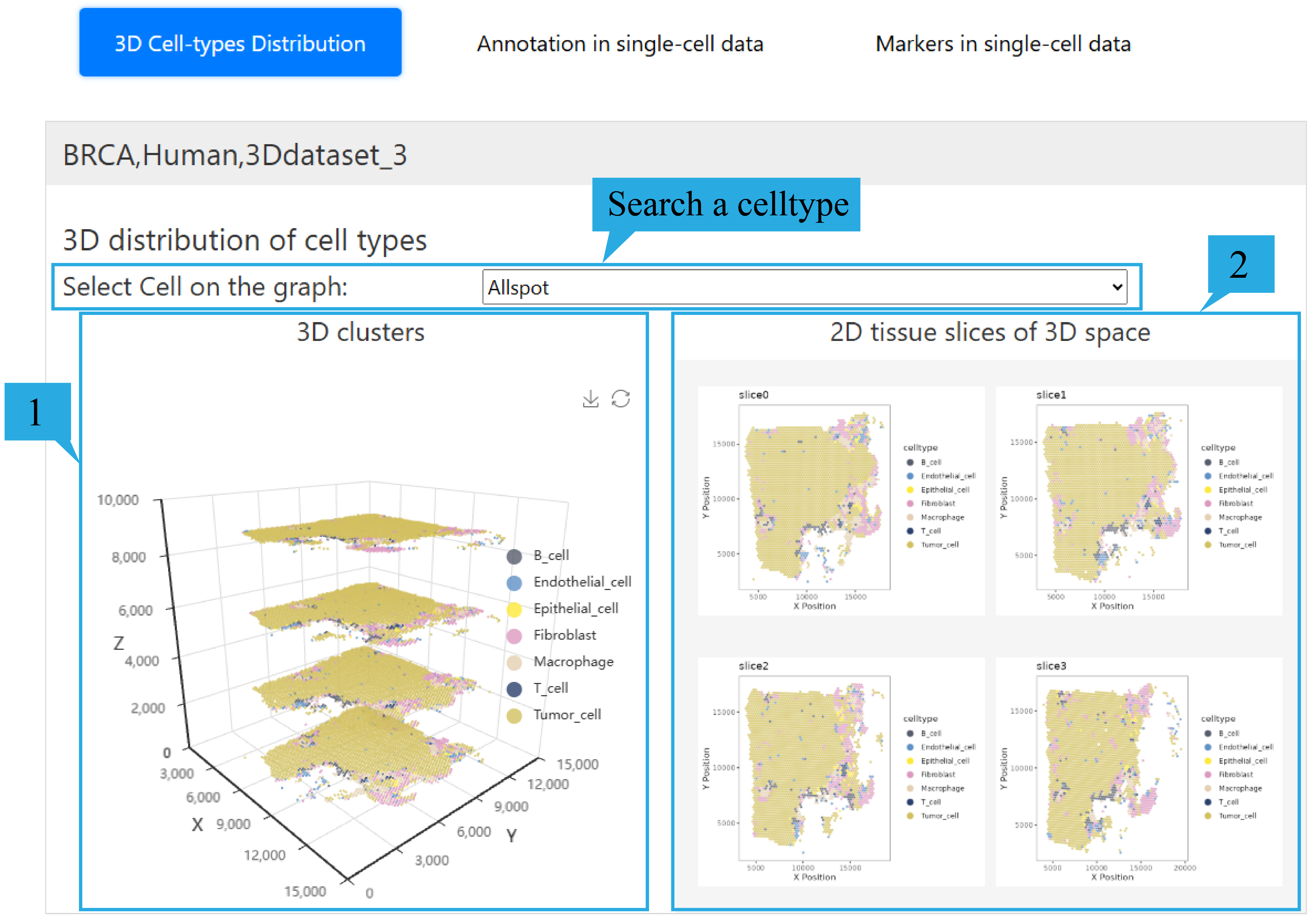 2. Users can select and view relevant information about cell Annotation as needed, such as "3D Celltype Distribution", "Annotation in single-cell data", and "Markers in single-cell data".