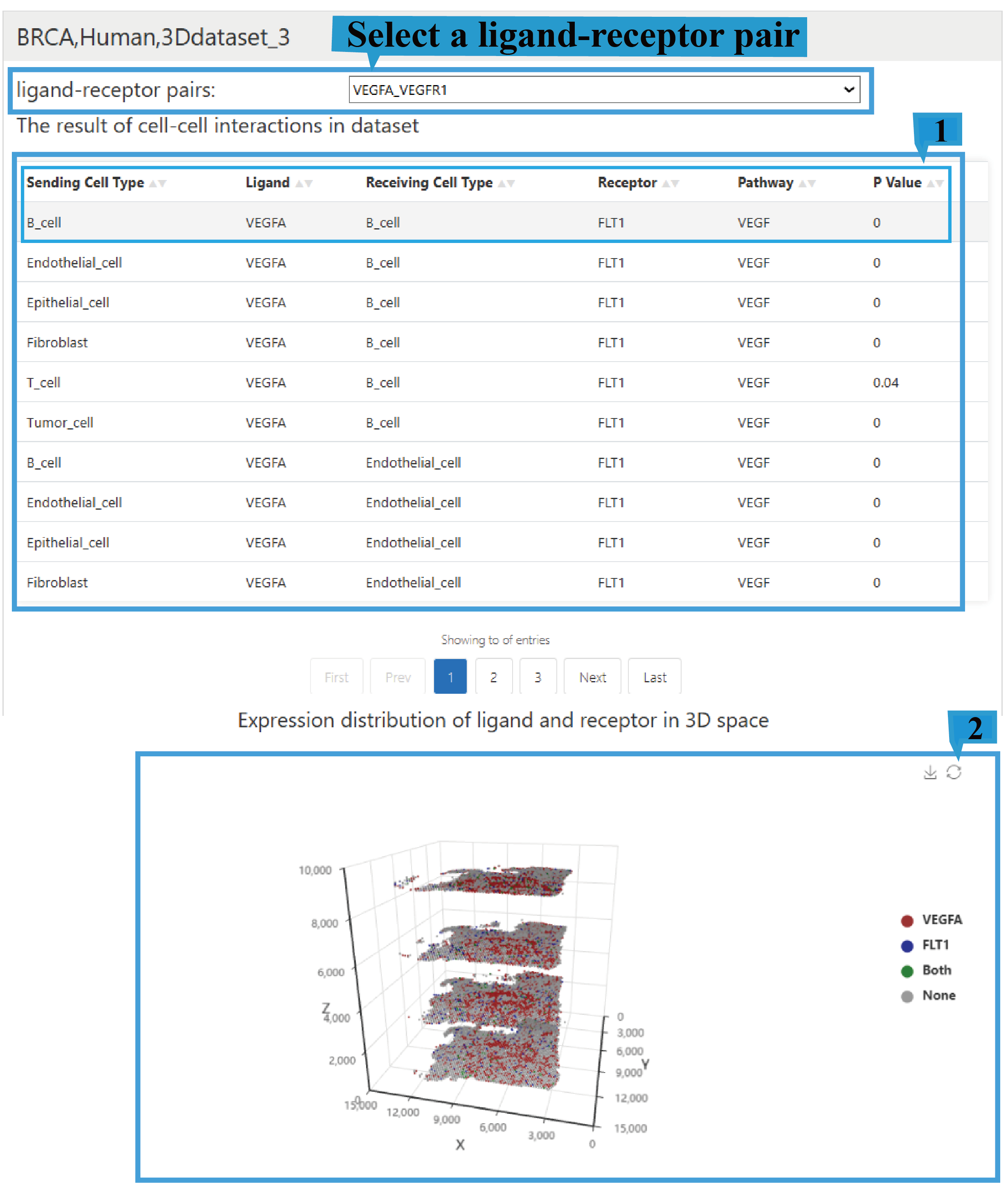 2.This visualization depicts the spatial expression patterns of ligands and receptors within a three-dimensional coordinate system. Chromatically encoded data points represent their respective distribution profiles across the spatial domain. A dedicated color legend adjacent to the plot indicates expression status for both molecular species. Users can drag the mouse to rotate and view the distribution from different angles, and can also zoom in and out using the mouse wheel.