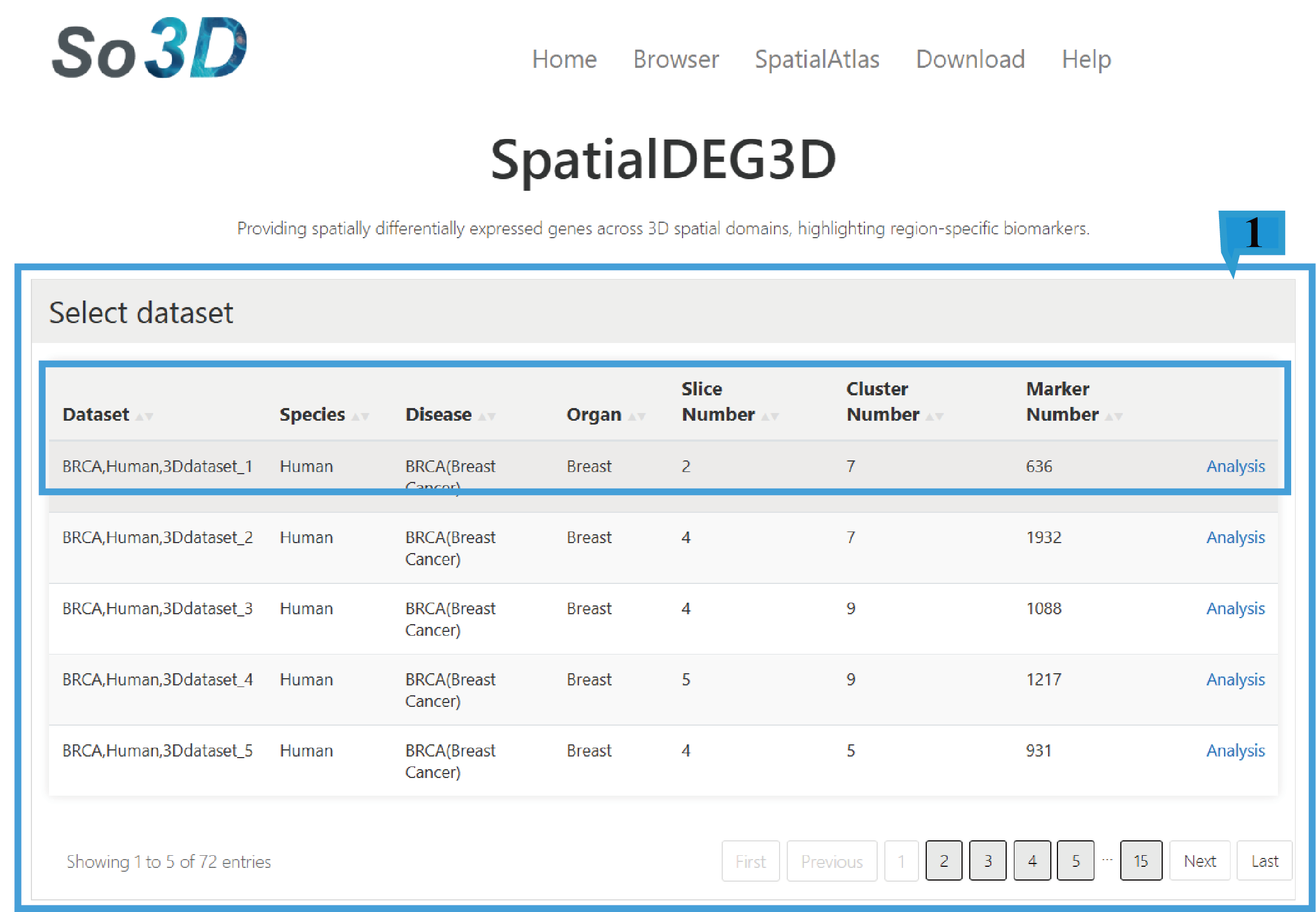 This function provides an overview of 72 datasets, including Dataset ID, Species, Disease, Organ, Technology, Slice Number, Cluster Number and Marker Number, Click the arrow next to the text to sort the list based on the content of that column. To analyze regulatory differences between genes, users need to click on the "Analysis" corresponding to the dataset of interest.