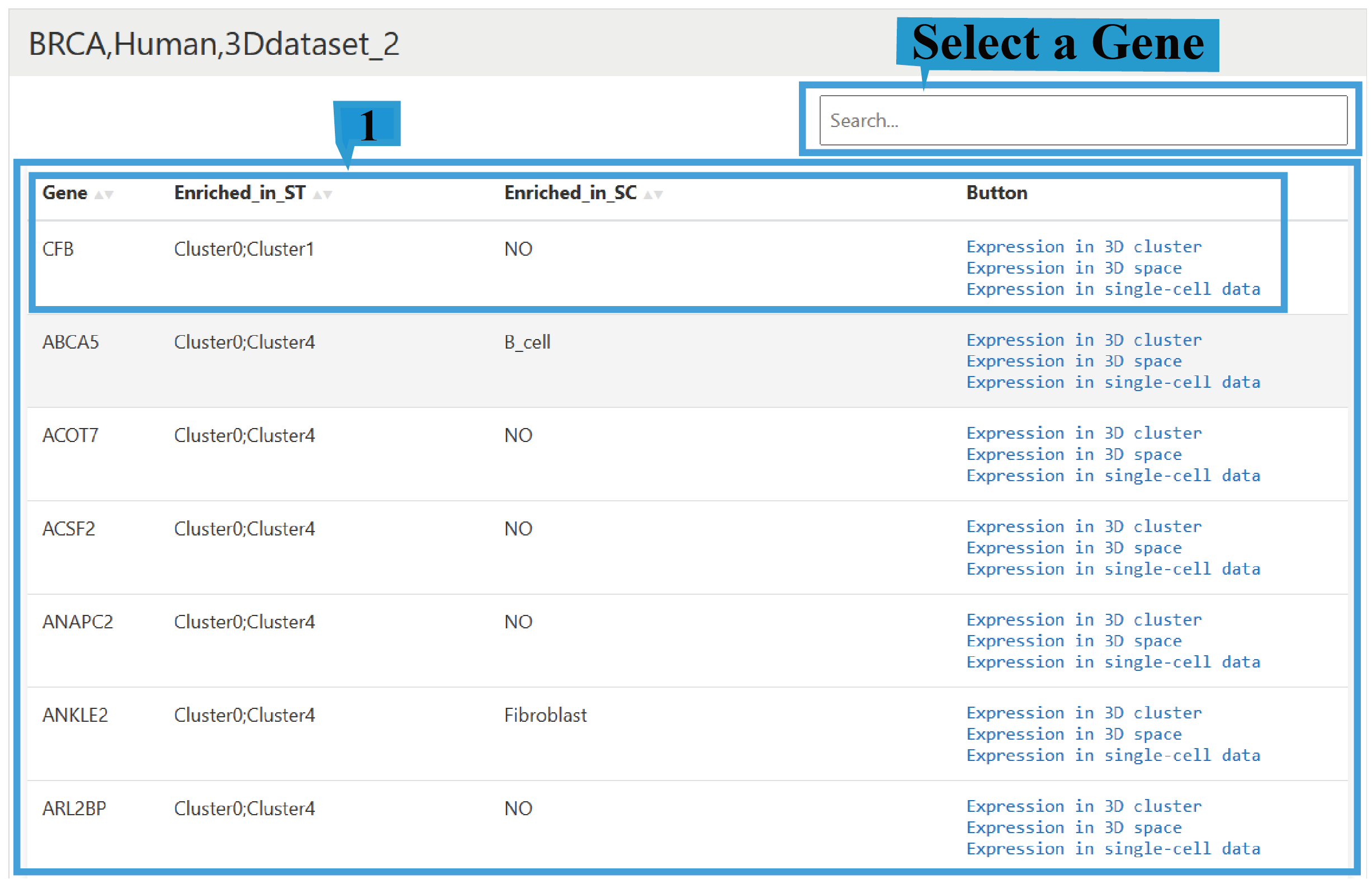 Users can enter the target gene name in the "Search" field to fuzzy match the corresponding gene. Furthermore, on the gene search page, spatial clusters enriched with the gene and cell types enriched in single-cell data can be viewed (where "NO" indicates no significant enrichment), Click the arrow next to the text to sort the list based on the content of that column.