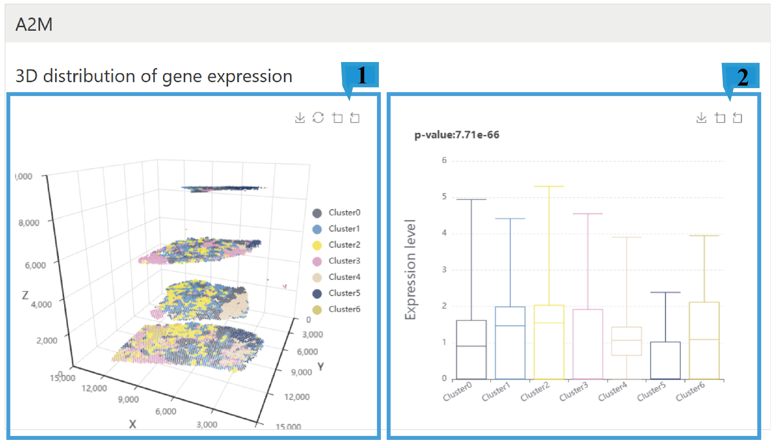 1.The 3D gene expression plot shows the spatial distribution of gene expression across different cell clusters in three-dimensional space. Users can rotate the view by dragging the mouse to observe gene expression from various angles. Additionally, users can zoom in and out and save the visualization using the icons located at the top right of the plot. Different colors represent different clusters.