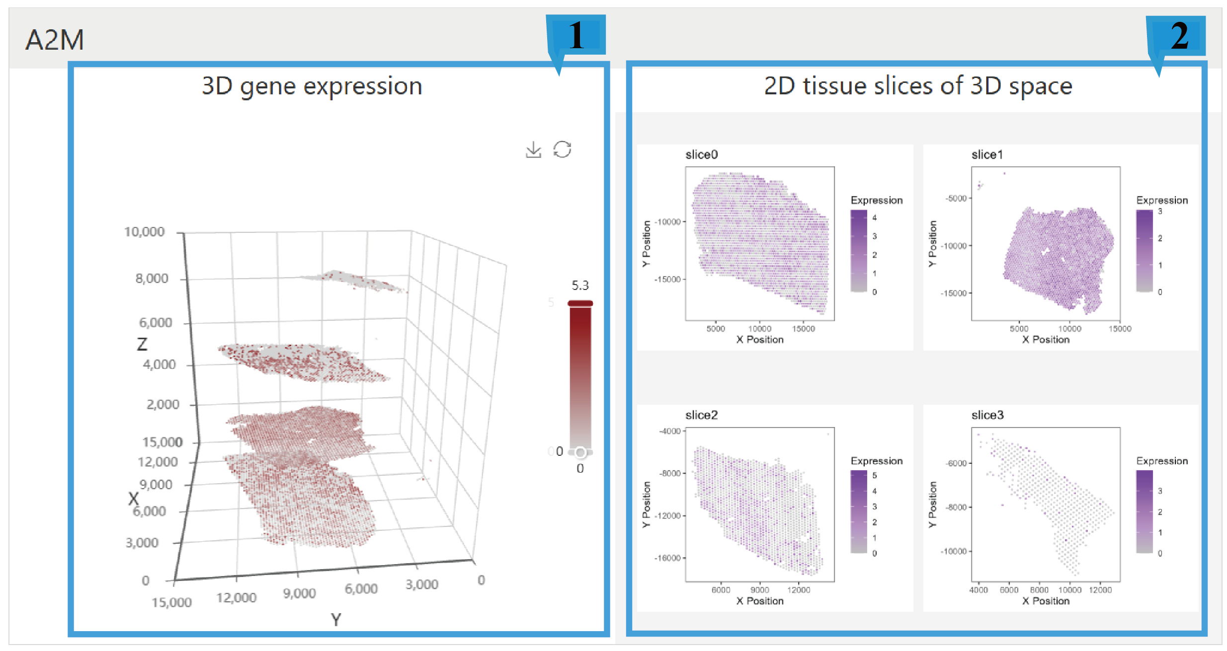 2.The 2D tissue slices of 3D space show the gene expression across different two-dimensional slices within the three-dimensional space. Clicking on the 2D tissue slices allows for zooming in. Each subplot has a color bar on the right side, indicating the level of gene expression, with darker colors representing higher levels of gene expression.