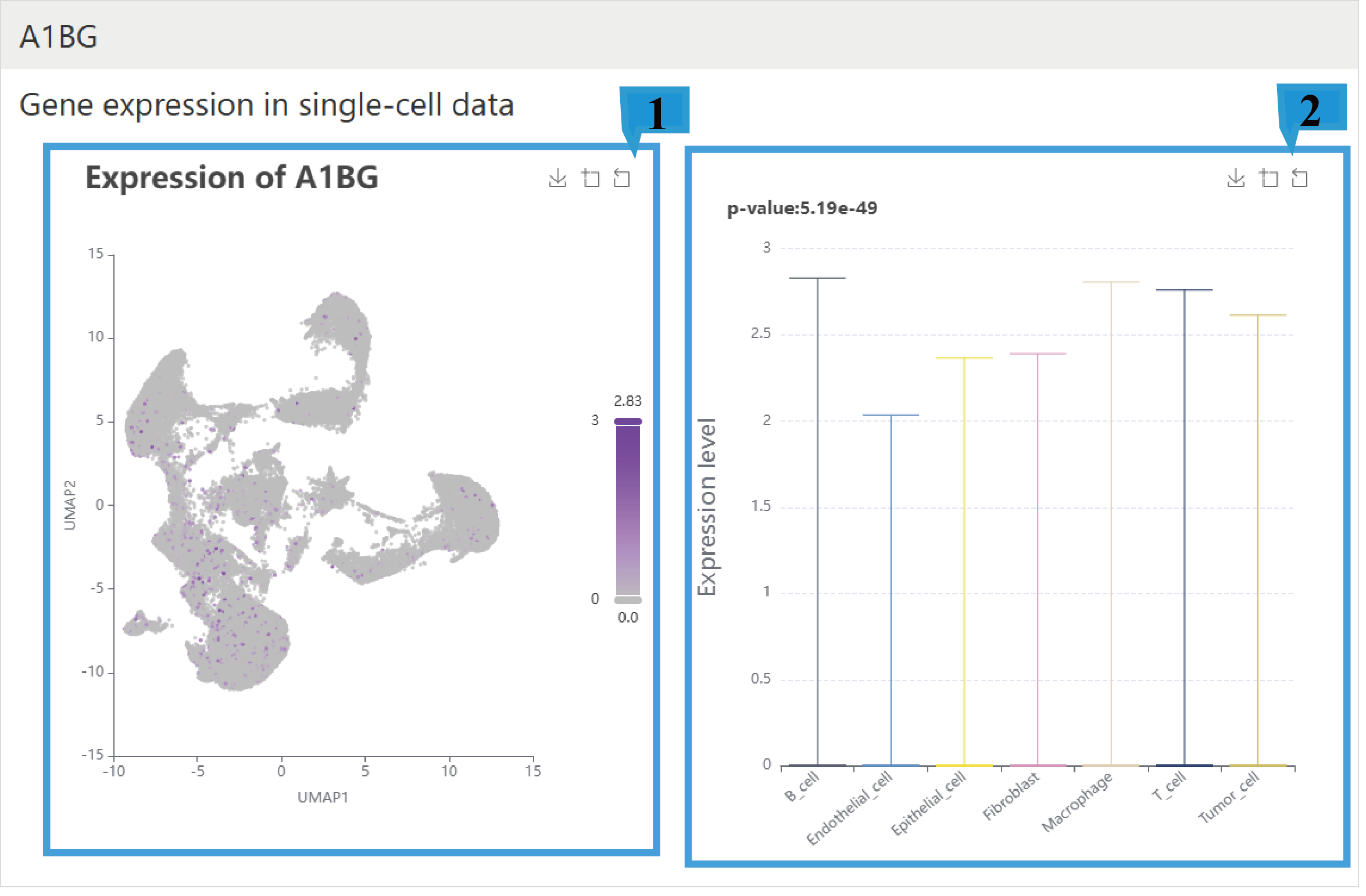 1.The UMAP plot shows the distribution of gene expression in single-cell data, with the color bar representing the level of gene expression, where darker colors indicate higher levels of gene expression. The top right corner provides options to zoom in or out of areas and to save the visualization.