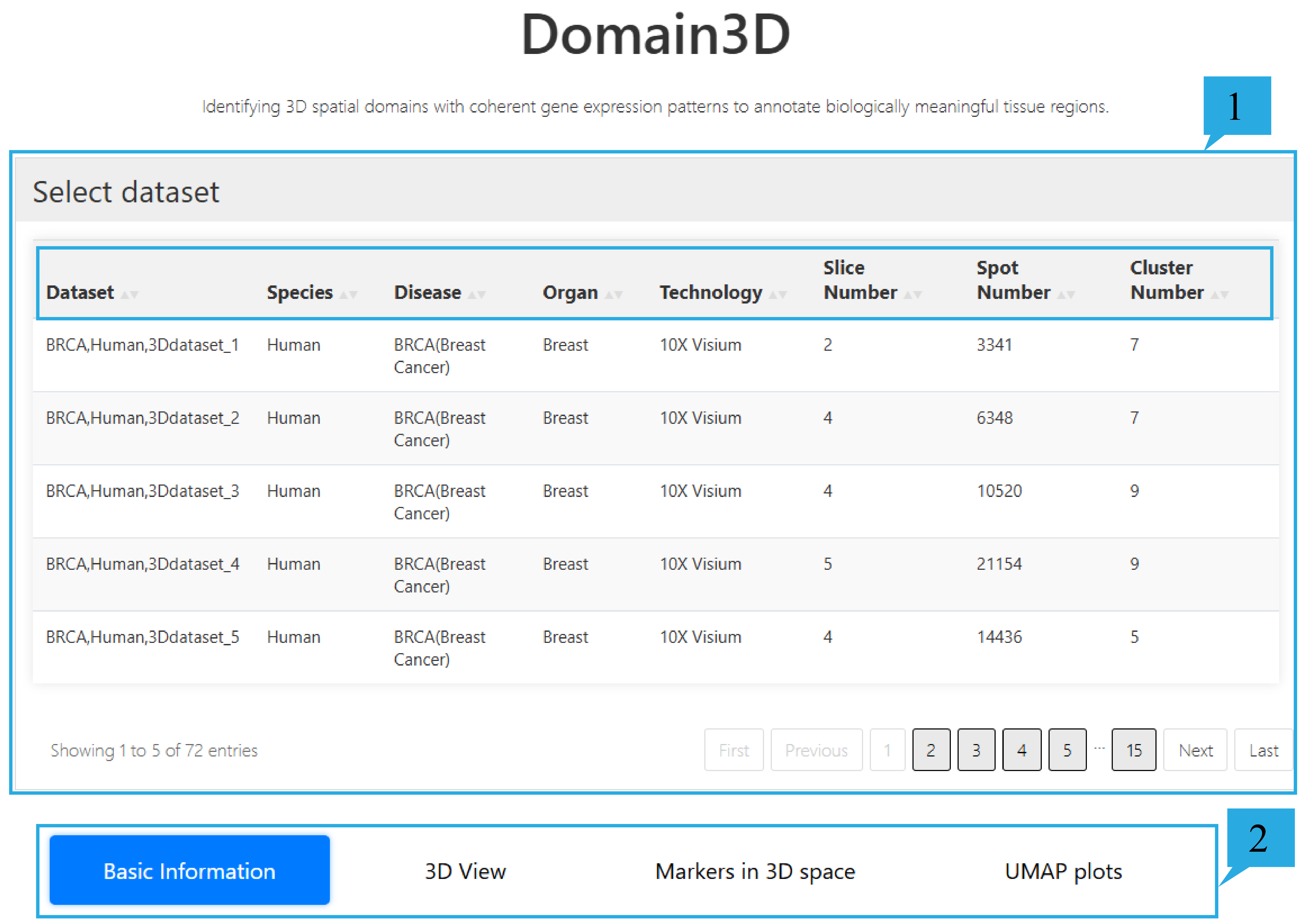 1.This function provides an overview of 72 datasets, including Dataset ID, Species, Disease, Organ, Technology, Slice number, Spot number, and Cluster number. Click on the text can sort the list based on the content of that column. Users can choose the datasets they are interested in as needed.