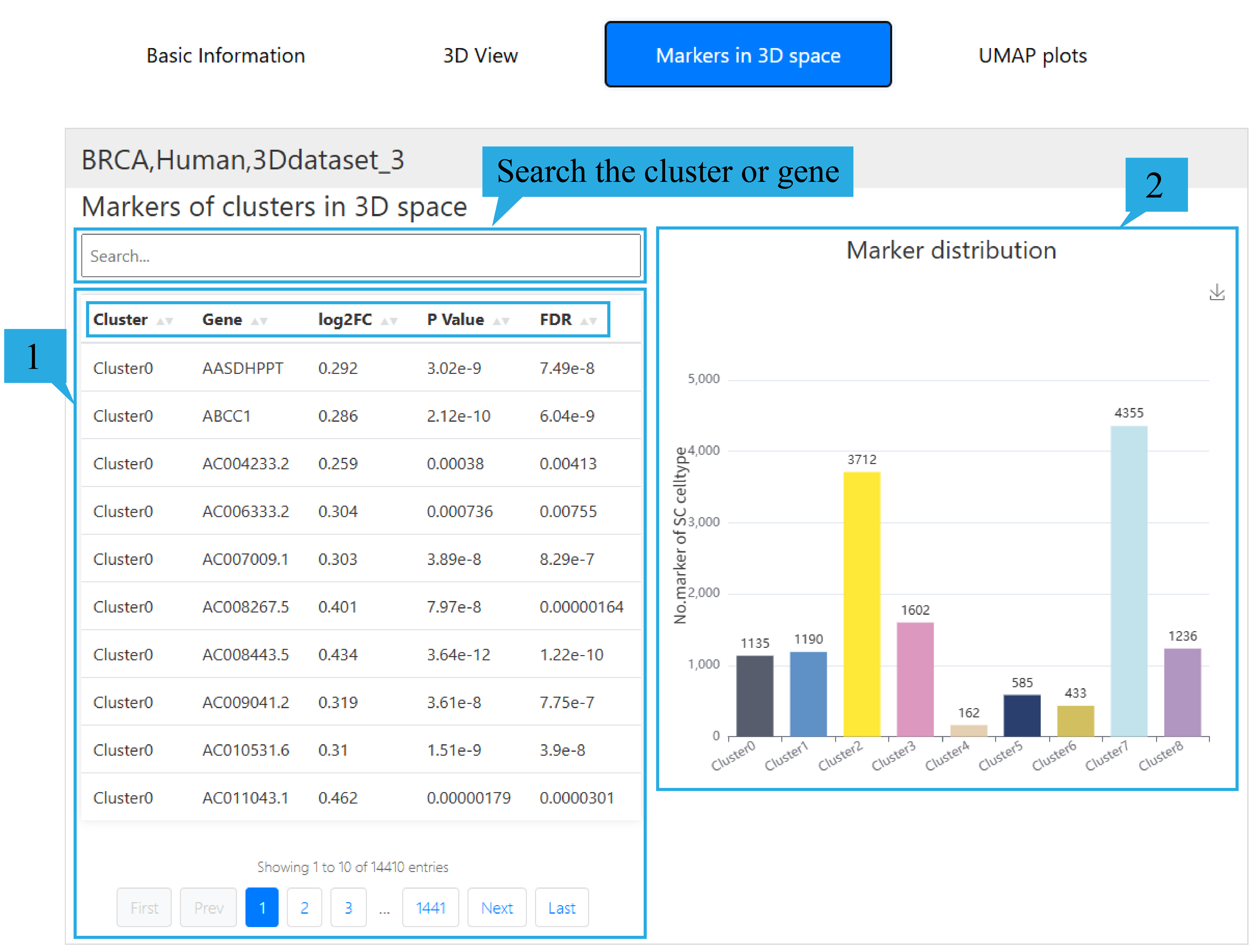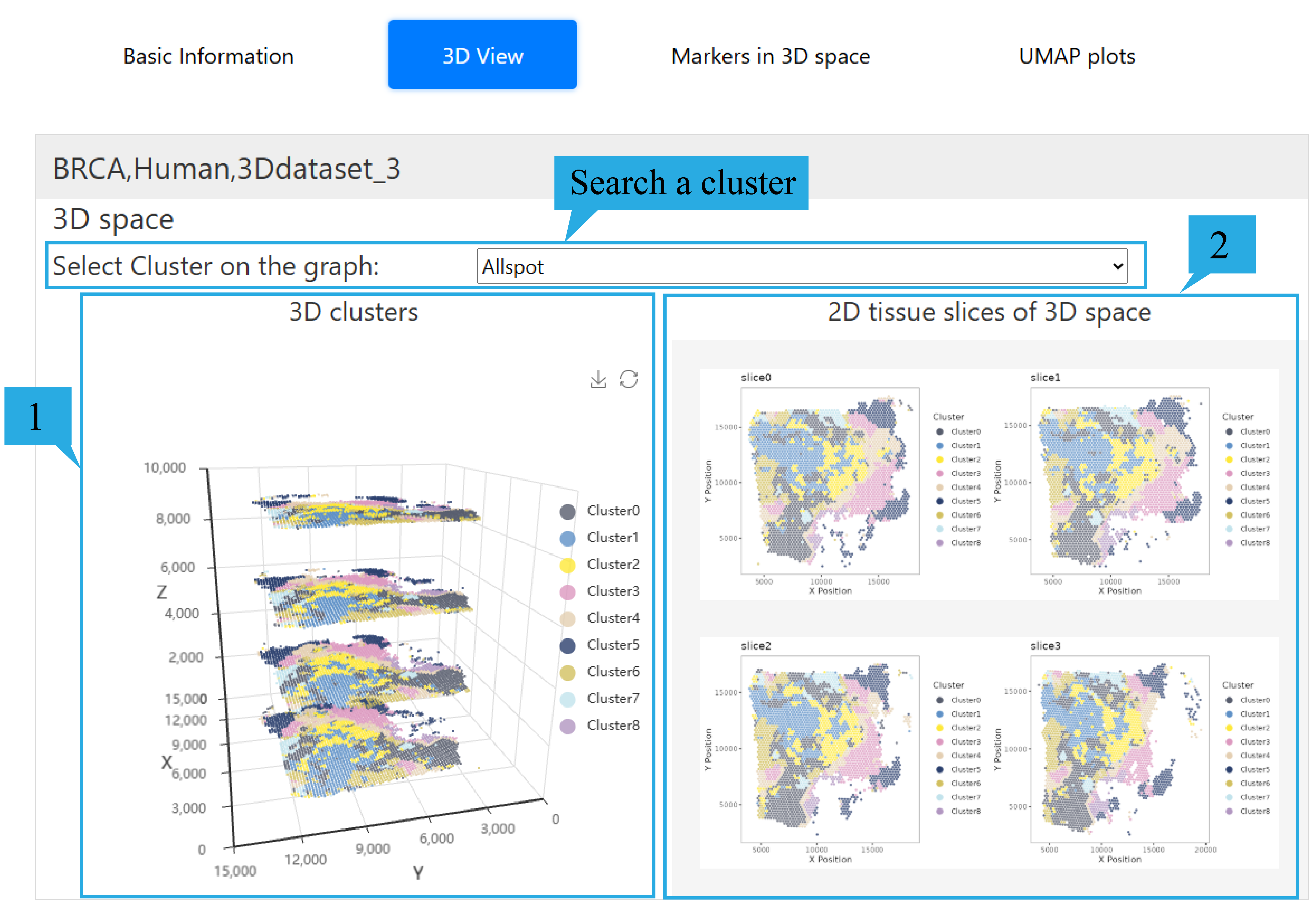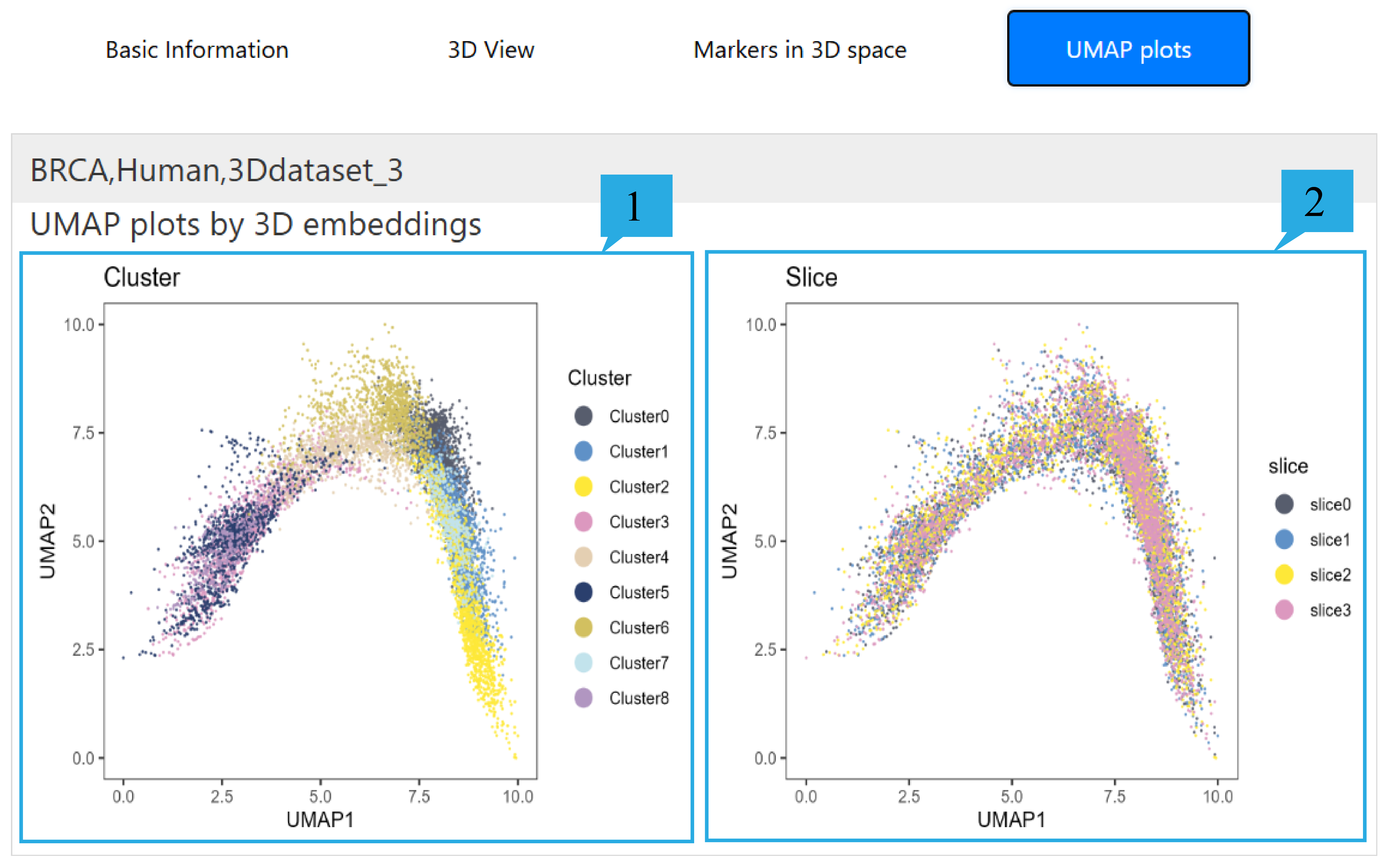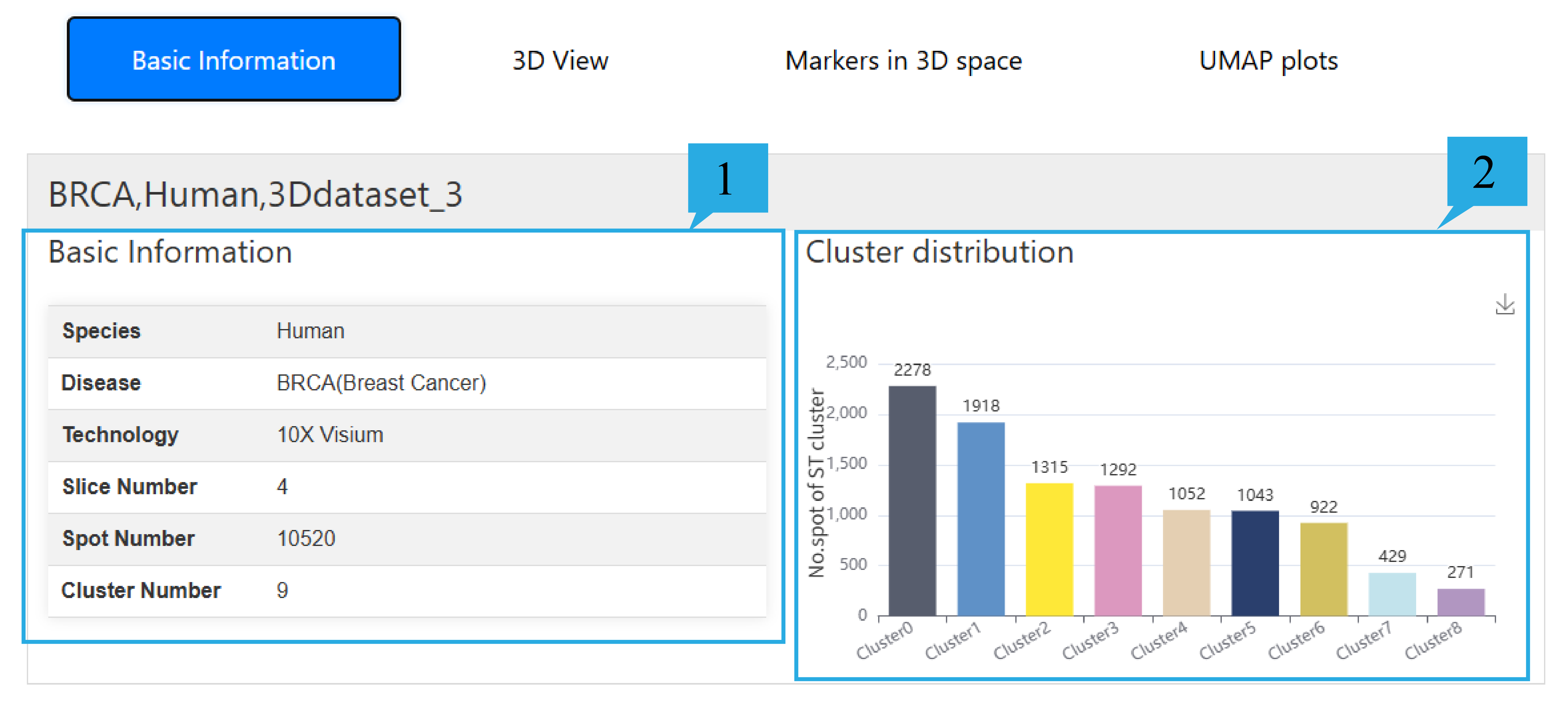 2. Users can select and view Information about the spatial domain as needed, such as "Basic Information", "3D View", "Marker in 3D space", "UMAP plots".