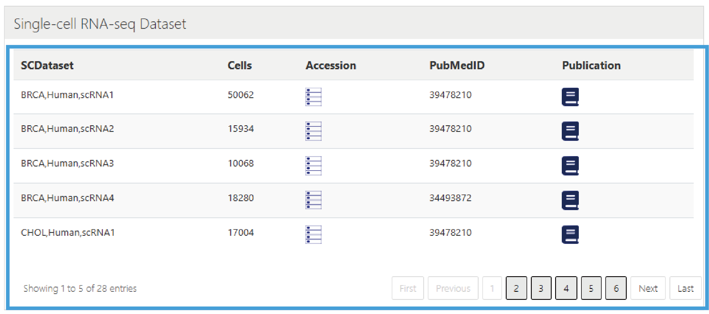 This section provides the download of single-cell datasets, presented in a list format, including Name of the single-cell dataset, Cell number , Data download links, PMID of related articles, and Publication links.