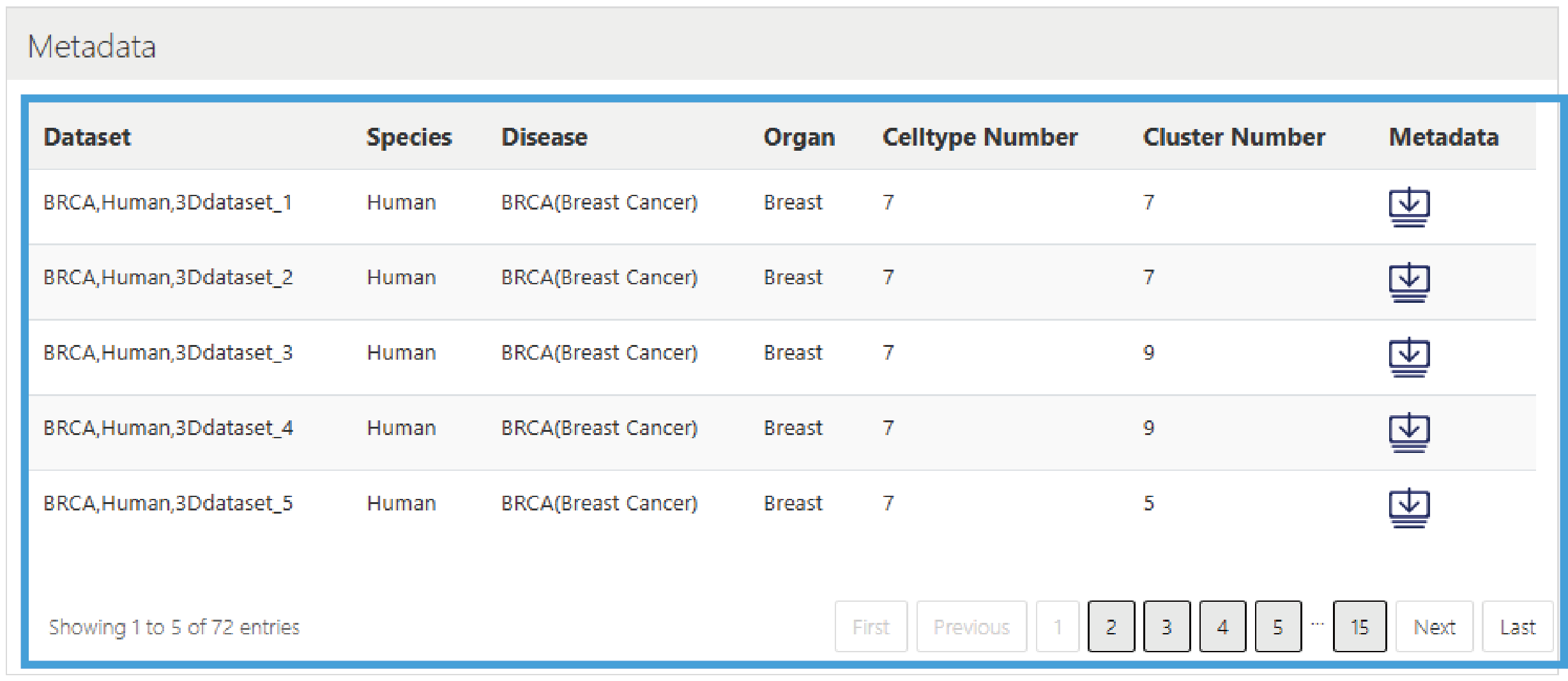 This section provides the download of metadata, presented in a list format, including the Dataset ID, Species, Diseases, Organs, Cell type number, Cluster number, and Metadata download link.