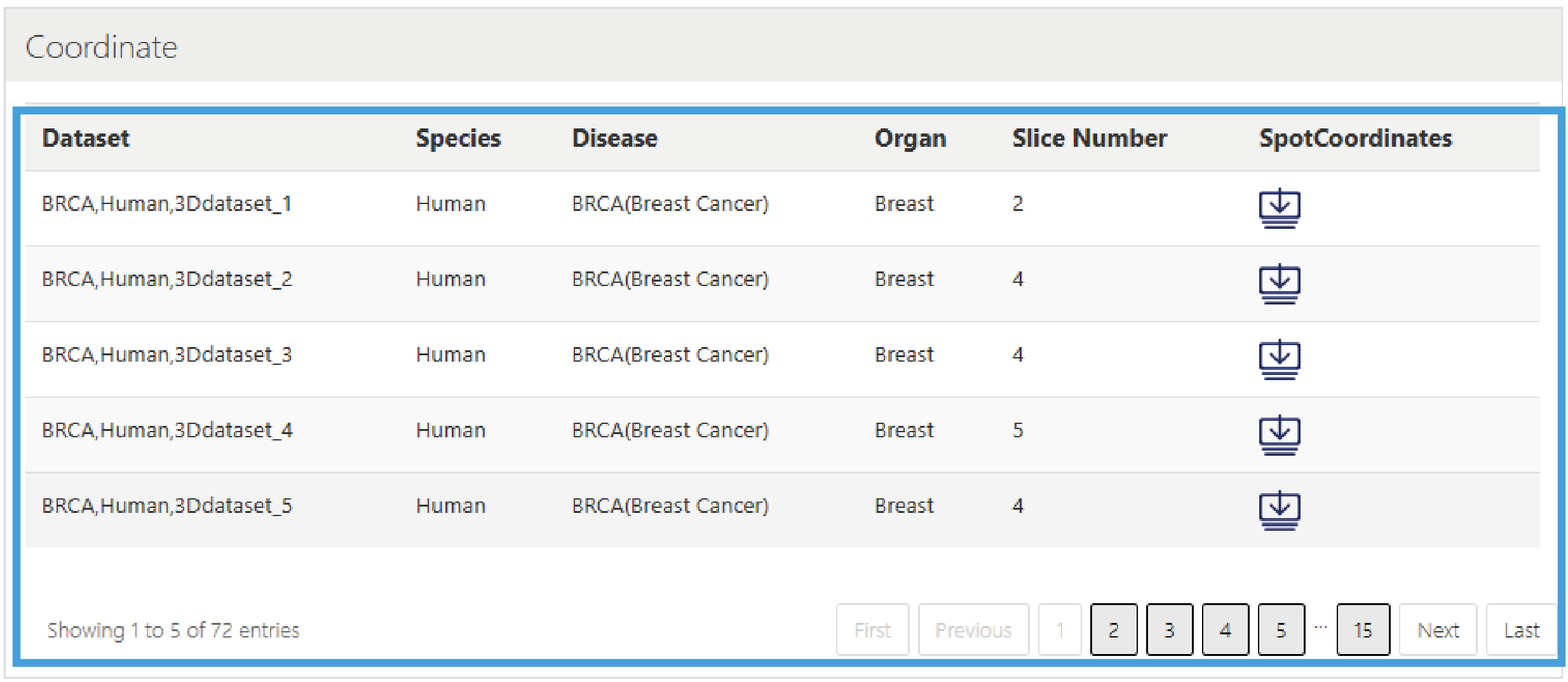 This section provides the download of 3d coordinates for spatial transcriptome datasets, presented in a list format, including the Dataset ID, Species, Disease, Organ, Slice number, and Download links for spot coordinates.