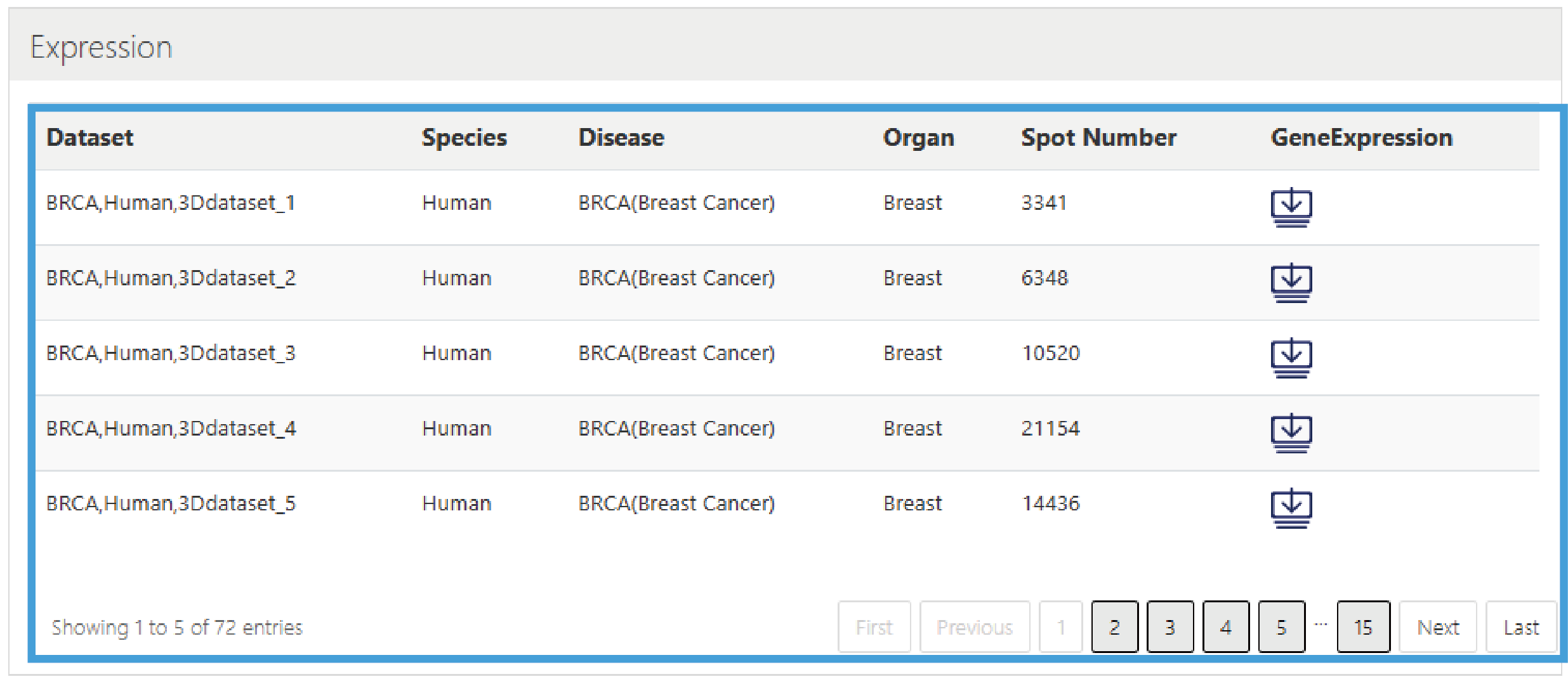 This section provides the download of gene expression data from spatial transcriptome datasets, presented in a list format, including Dataset ID, Species, Disease, Organ, Spot number, and Download link for gene expression data.