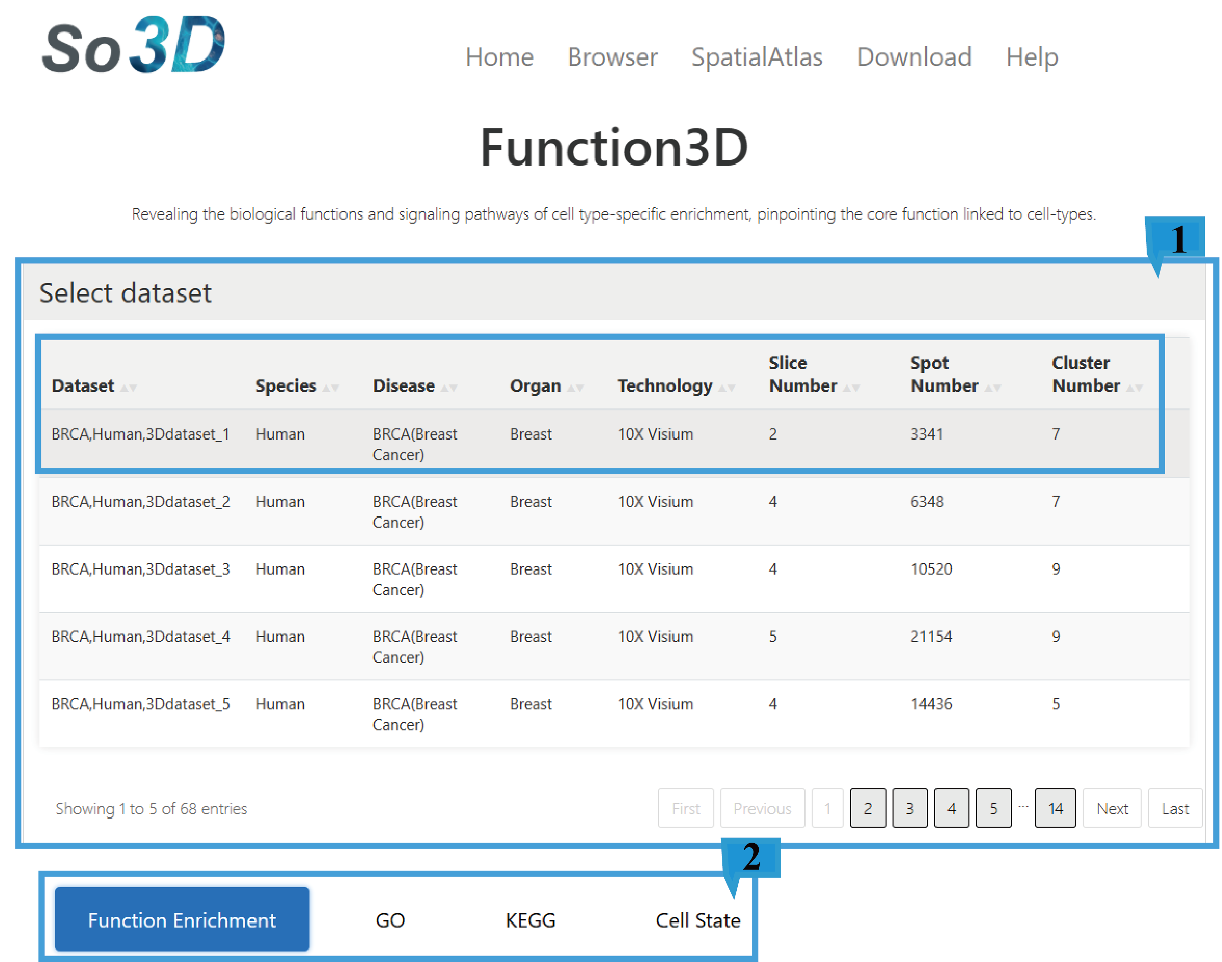 1.This function provides an overview of 72 datasets, including Dataset ID, Species, Disease, Organ, Technology, Slice Number, Spot Number and Cluster Number, Click the arrow next to the text to sort the list based on the content of that column. Users can select the dataset of interest as needed.