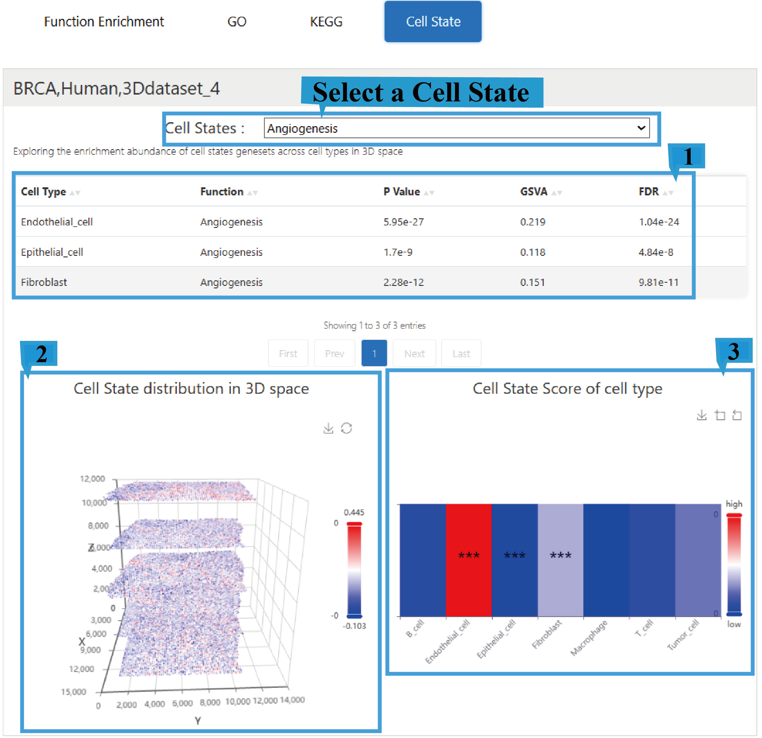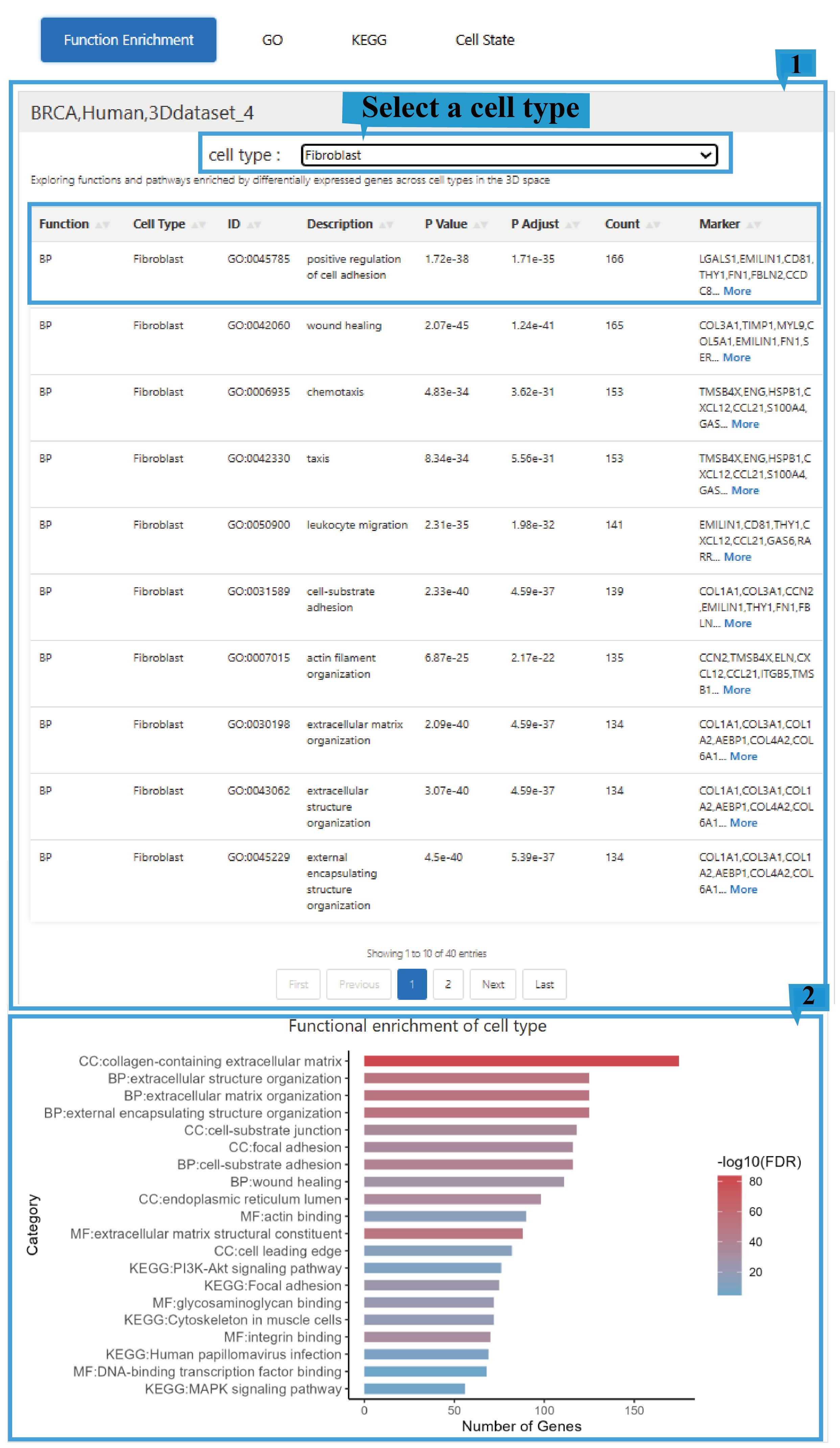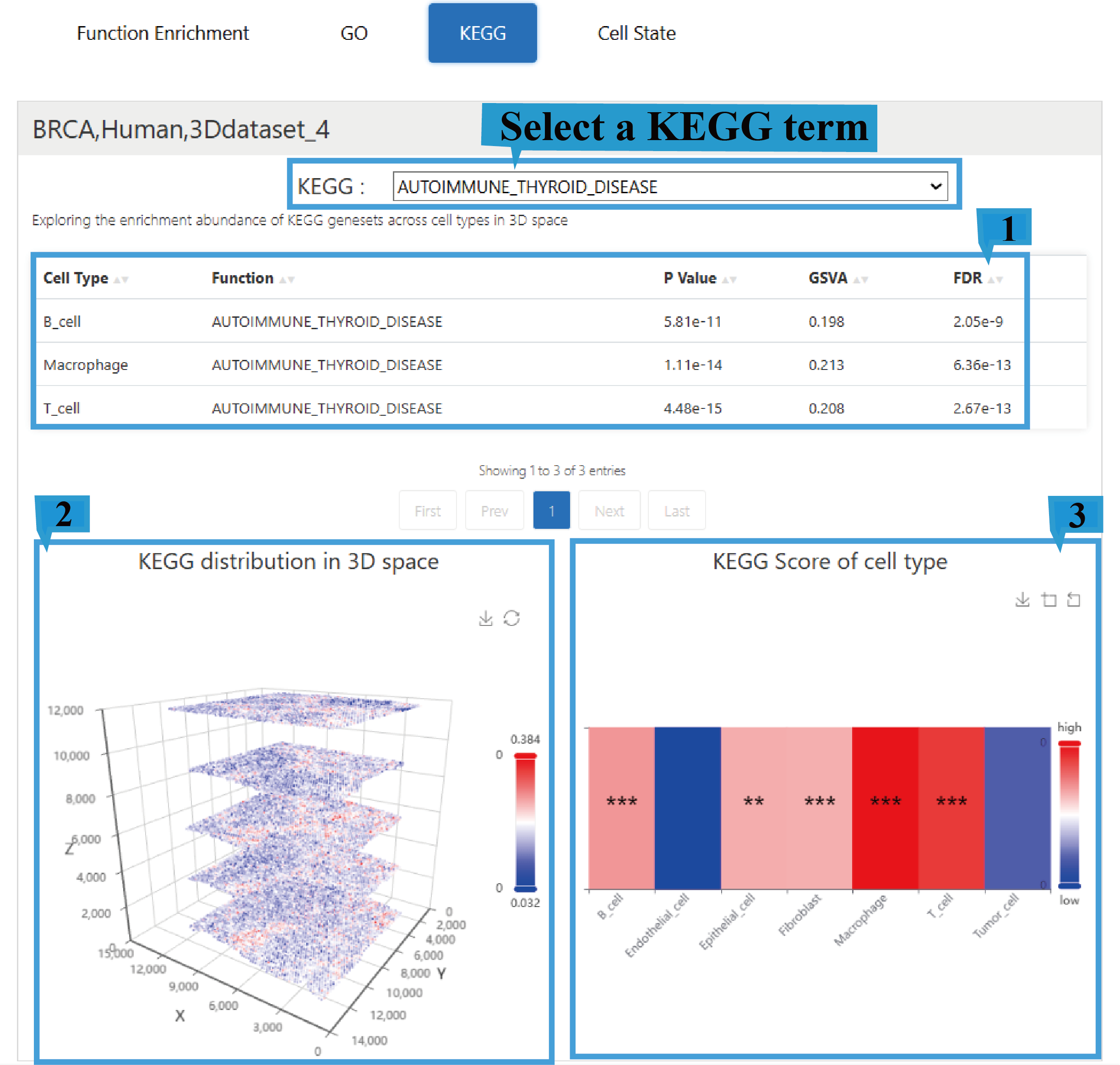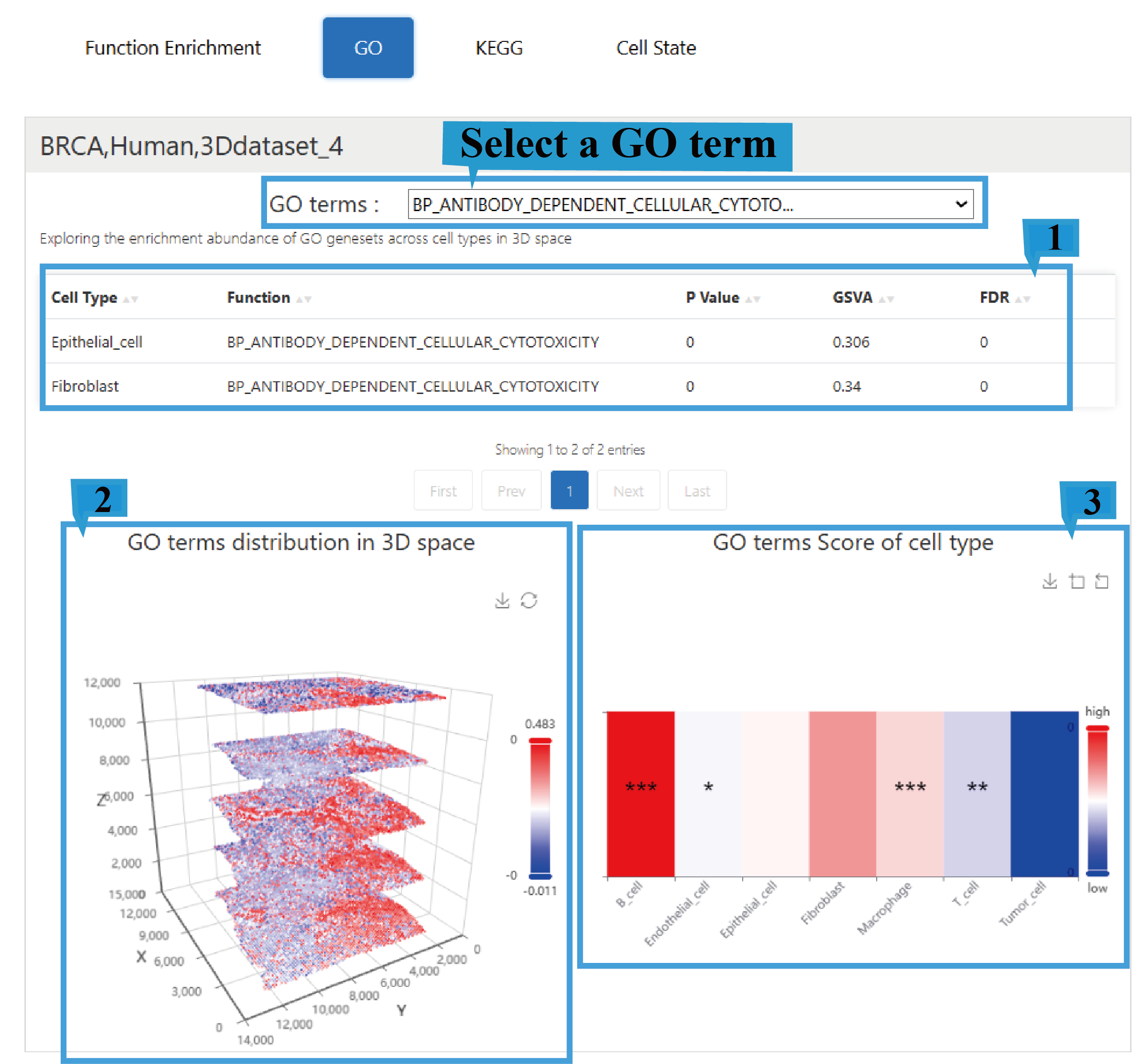 Function3D: Four Enrichment analyses were conducted on the 3D spatial transcriptome, namely Function Enrichment,GO,KEGG and Cell State. The enrichment analysis results are presented in the form of tables, pictures and 3D models.