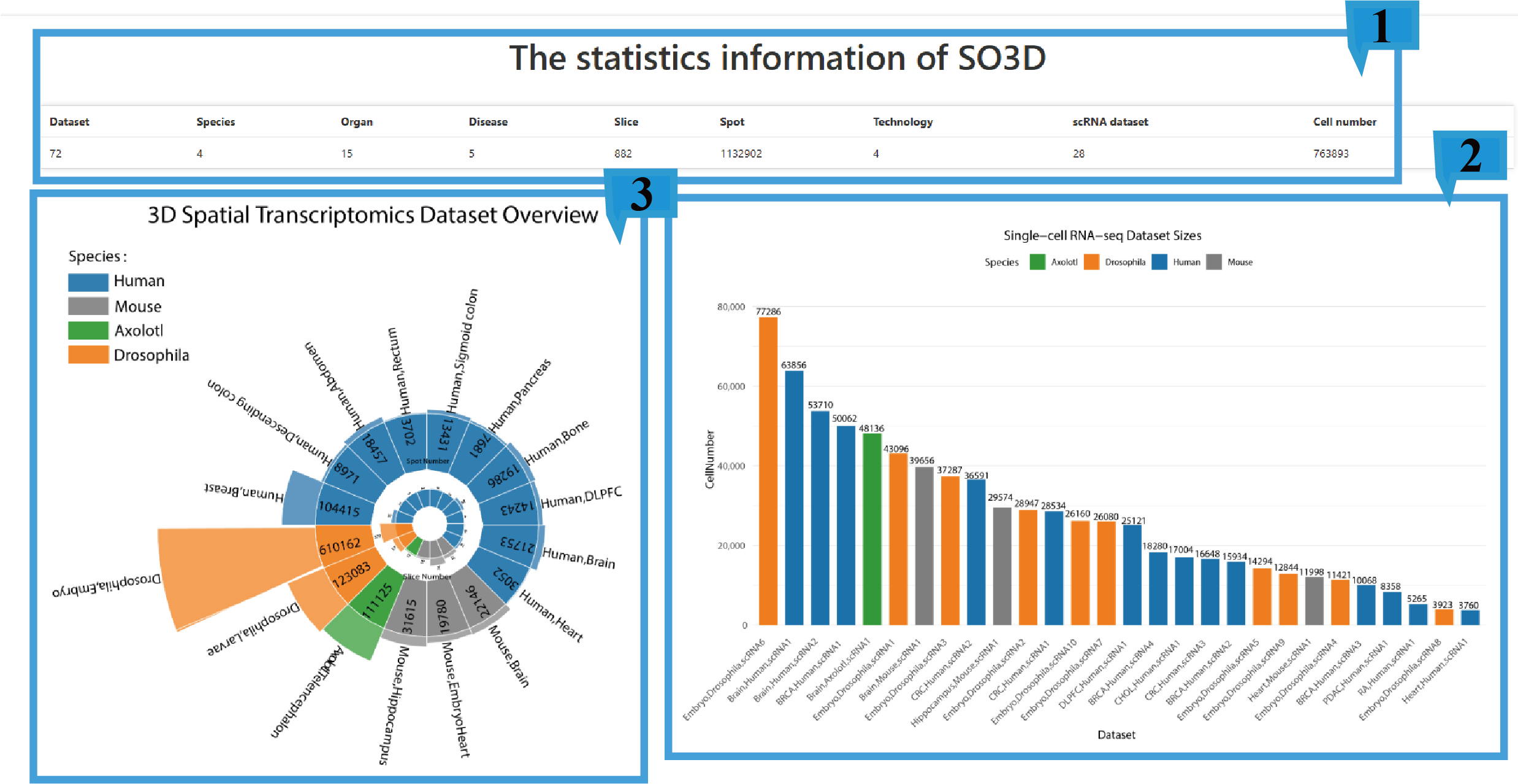 Firstly, the browse page provides an overview of the statistical information of the 3D spatial transcriptome datasets and related single-cell datasets in the database.