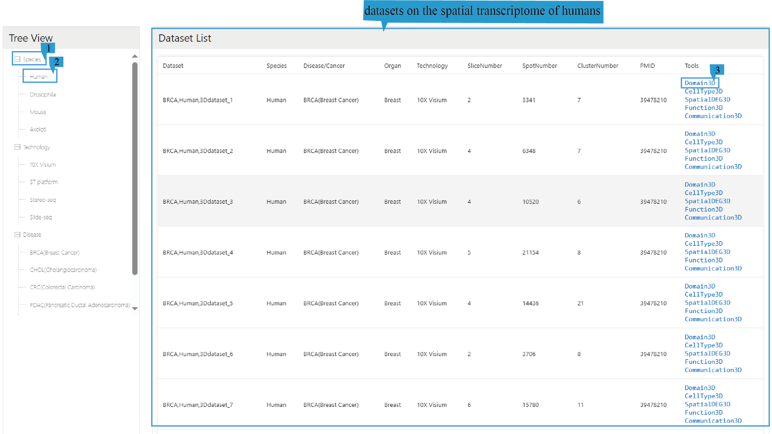 In addition, the browsing page is structured based on different species, sequencing technologies, diseases, and tissue stratification, and the relevant spatial transcriptome data information will be displayed in a tabular format. Click on the text can sort the list based on the content of that column.To browse 3D spatial transcriptome datasets related to a specific species (such as human), click "Species" (Step 1 in the figure below), and then select "Human" (Step 2 in the figure below). This will return 3D spatial transcriptome datasets related to humans. The results will be organized in a data table on the right side, with each row representing an associated record, including the dataset id, species, disease, organ, sequencing technology, number of slices, number of spots, number of clusters, and PMID. To browse the related analysis of spatial transcriptome datasets (such as human clustering analysis), click "Domain3D" (Step 3 in the figure below).